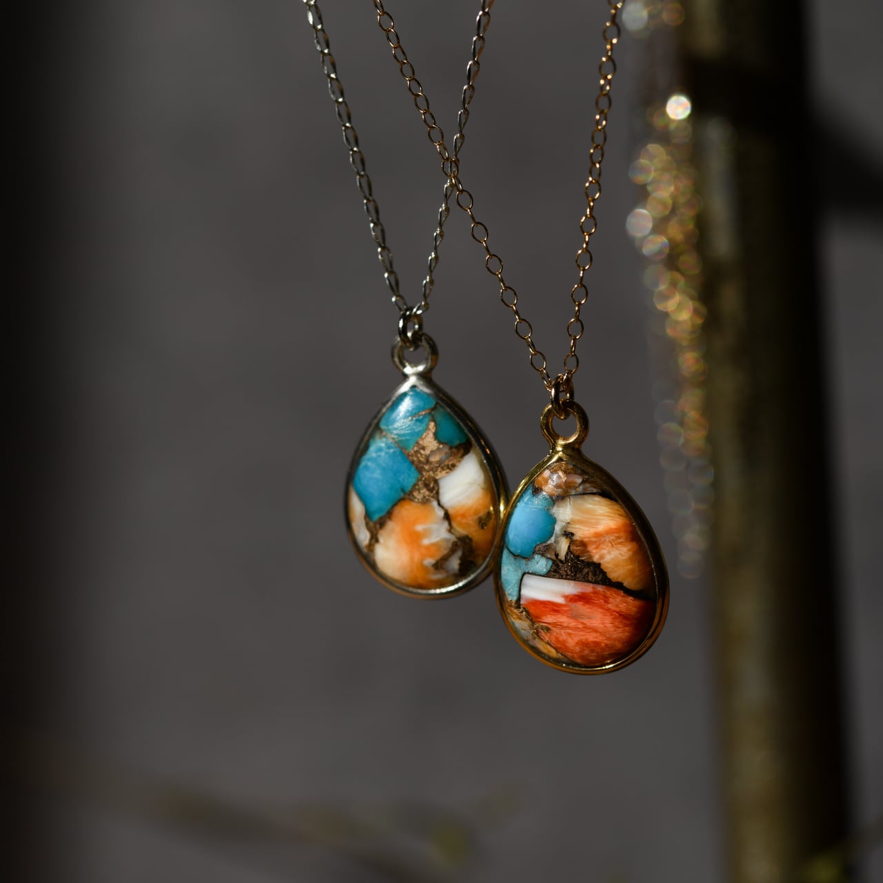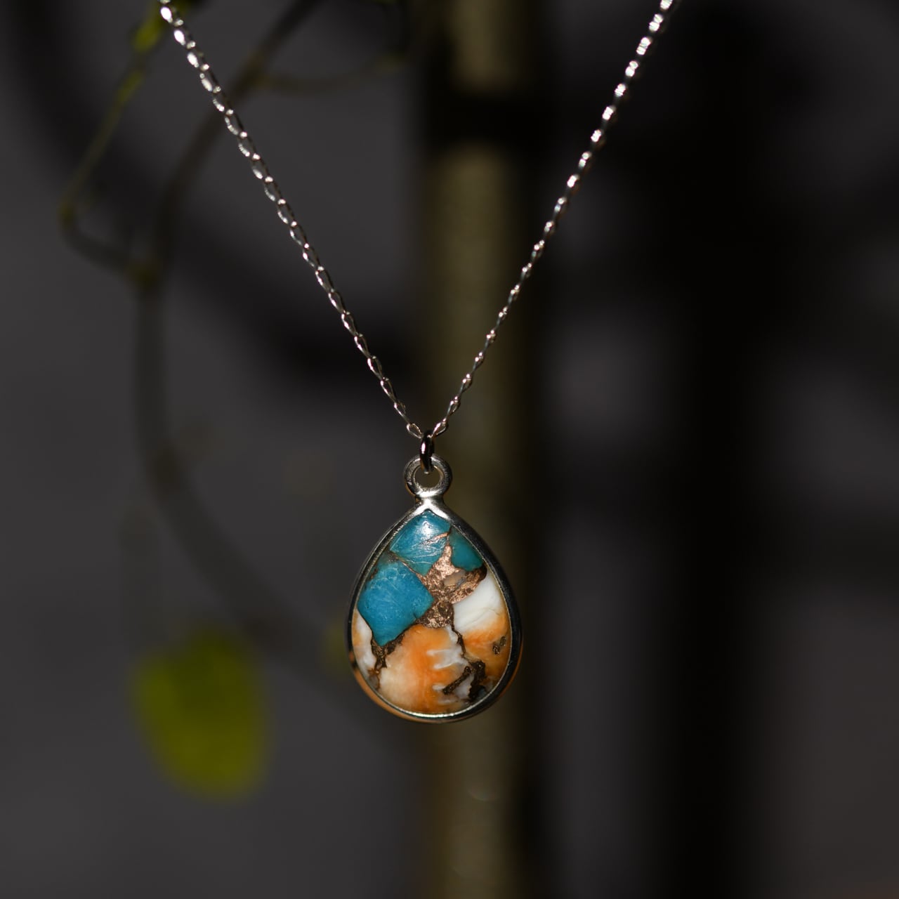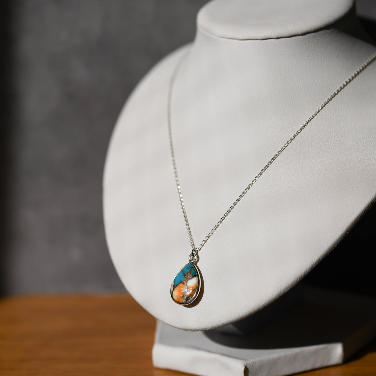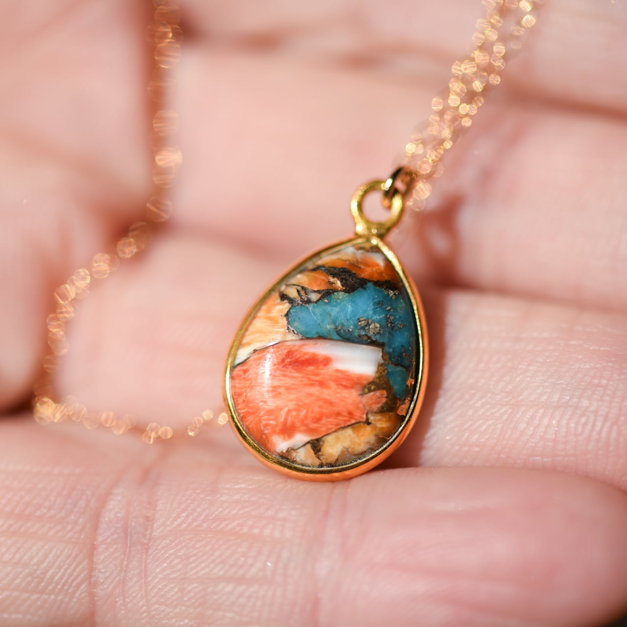 豊かな色彩と独特の模様が目を引くスパイニーオイスターカッパーターコイズのネックレス。